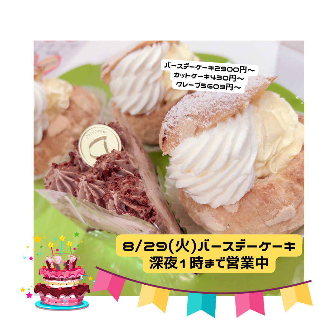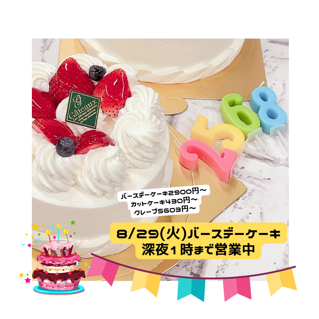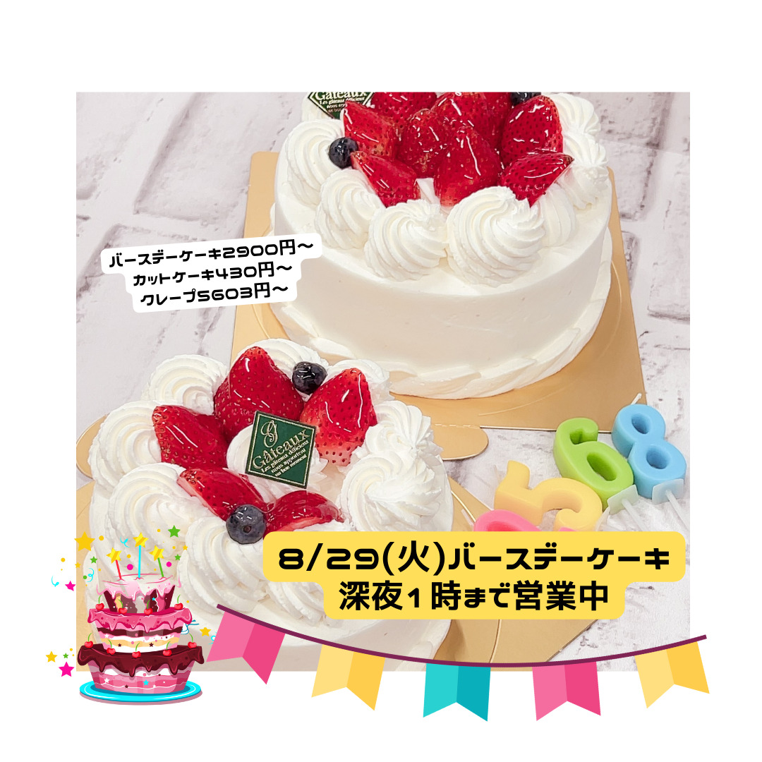 8/29(火)お急ぎOK誕生日ケーキ(当日デザインのみ)本日も深夜1時まで営業しております。
