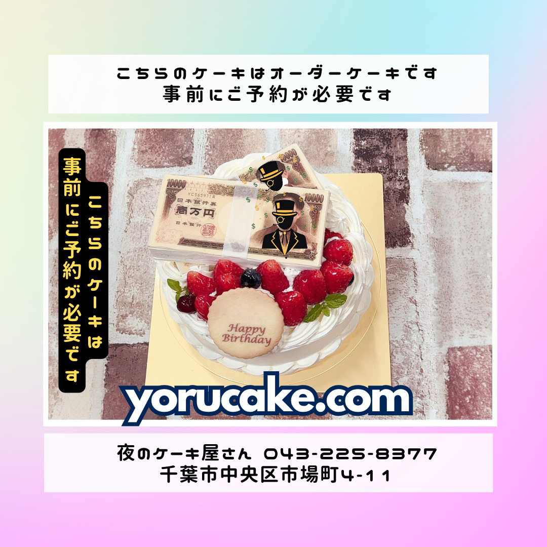 オーダーケーキ各種➔お金(お札・札束)ケーキ、ロゴケーキ、リボンケーキ、センイルケーキ、キャラクターケーキ、立体ケーキ、3Dケーキ、お花薔薇ケーキ、2段ケーキ、四角(スクエア)ケーキ、フルーツケーキ、写真食べられる写真ケーキ、電車乗り物ケーキ、たばこお酒ケーキ、その他多数