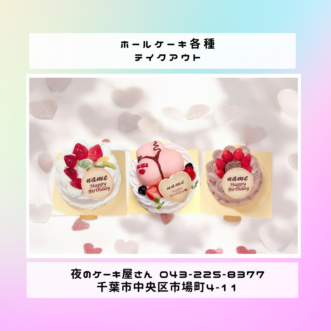 「夜のケーキ屋さん 千葉」で検索し🔎、当店のホームページからケーキの参考画像たくさん掲載しておりますので、✅ケーキのスクショを撮ってご相談いただけると適切なアドバイス、ご提案が出来ます。